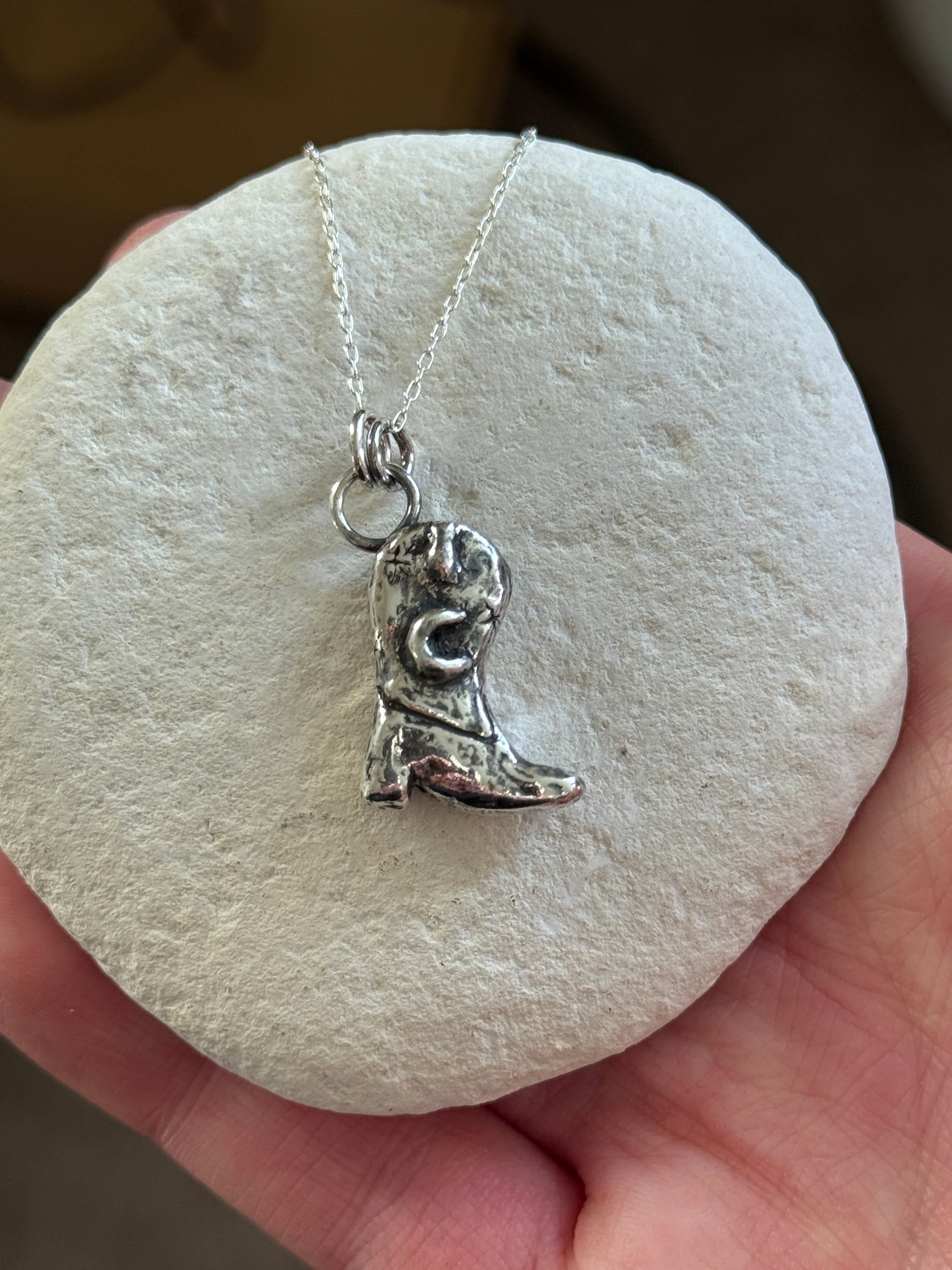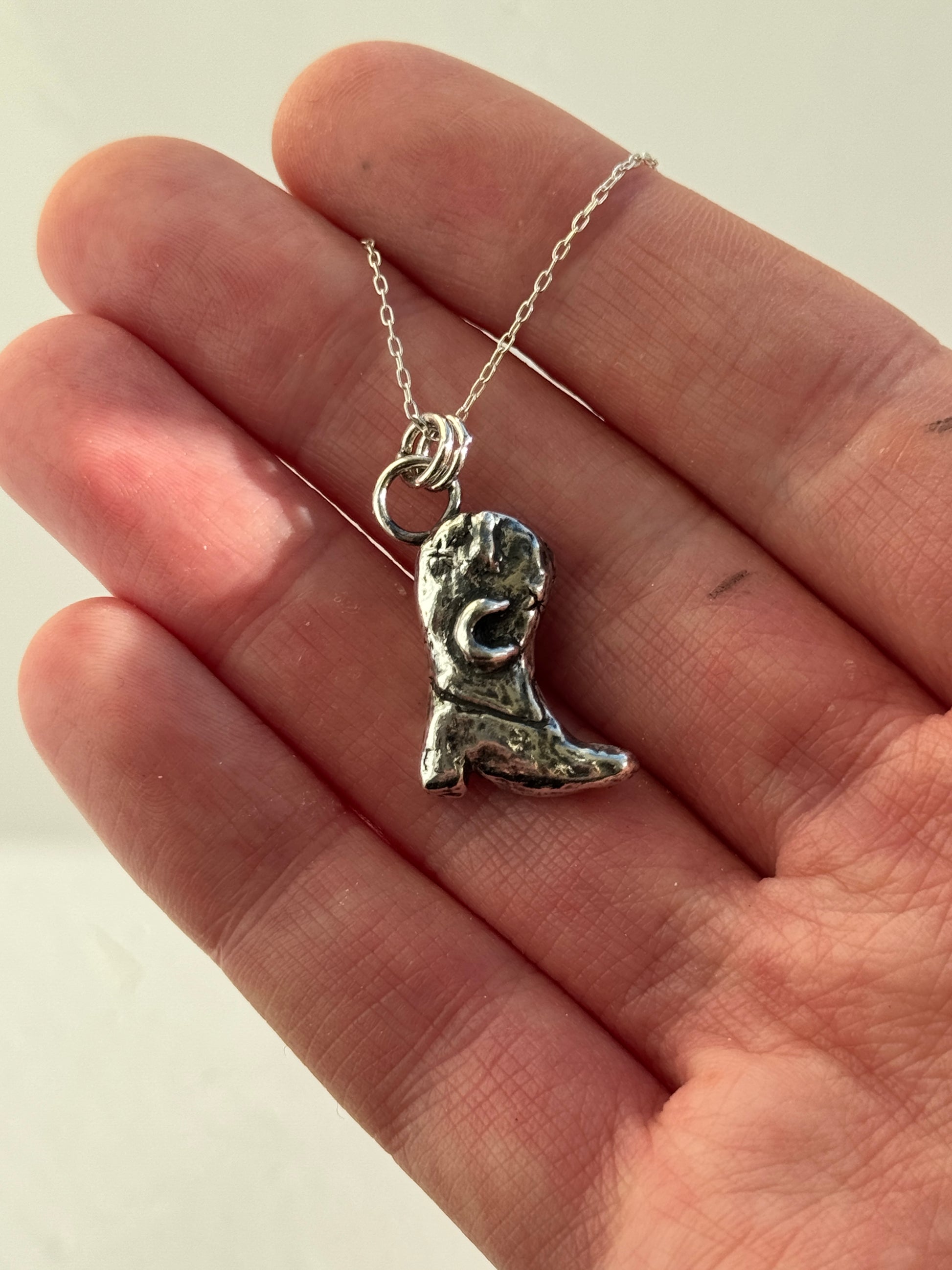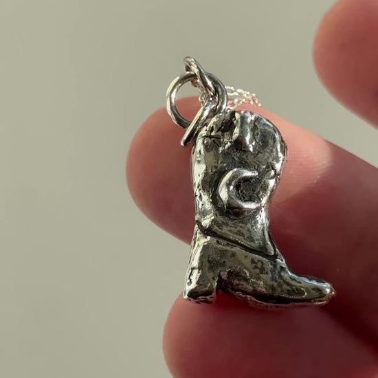 This beautiful cowgirl boot charm necklace was handmade using the lost wax method. Carved out of wax by myself and sent to the casted in Sterling Silver. This is for the souls who have that inner cowgirl in them and loves the moon.