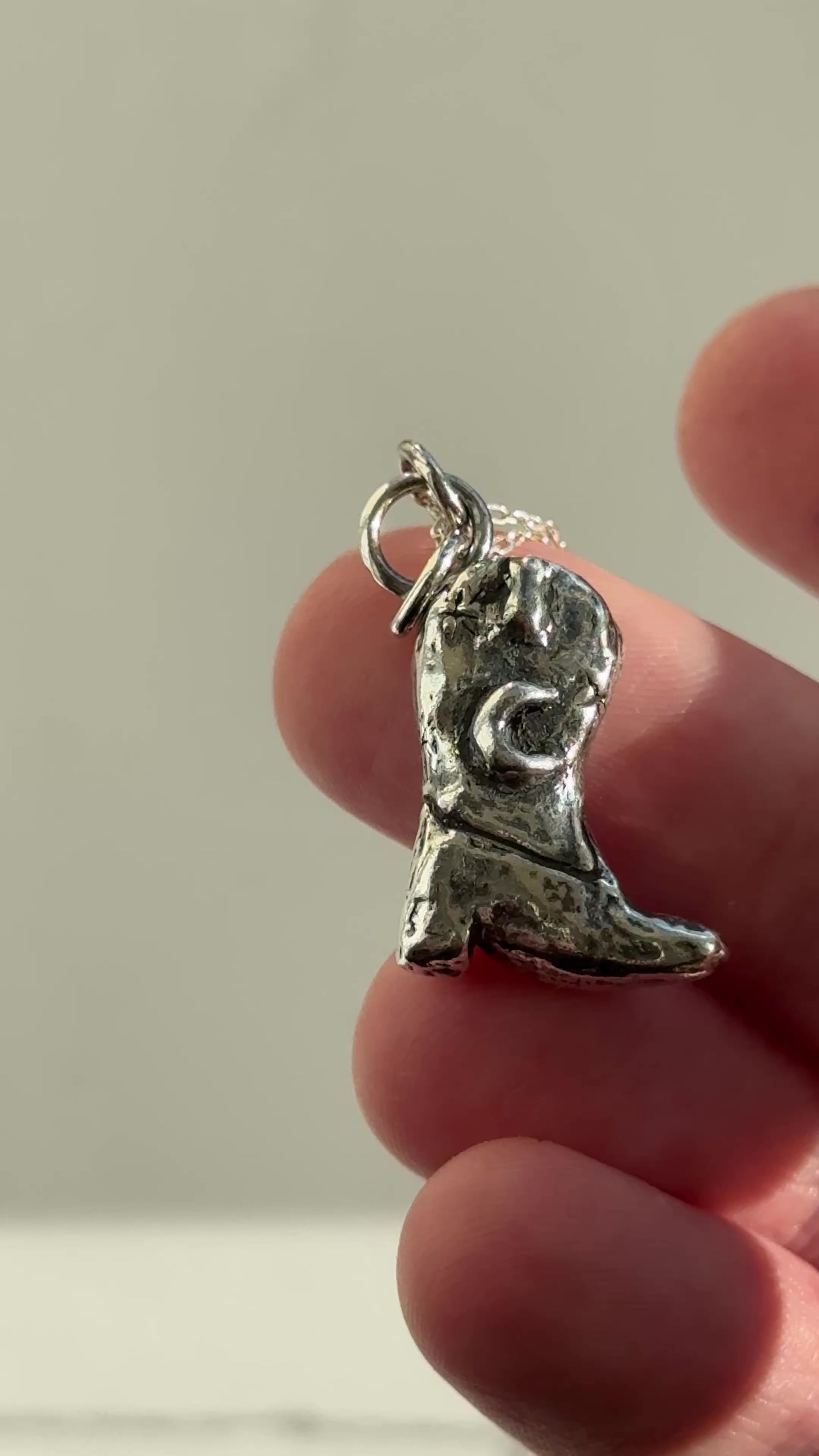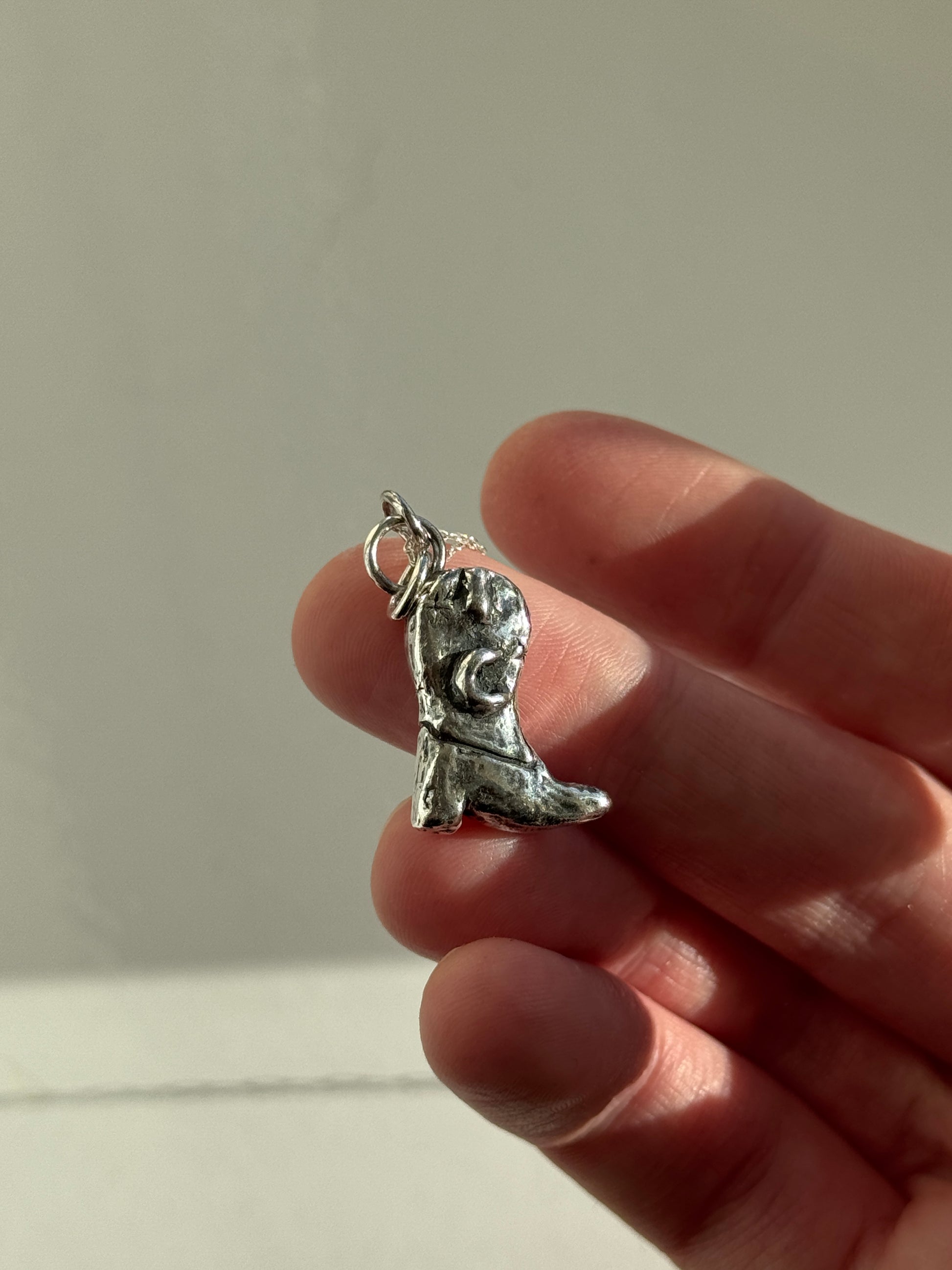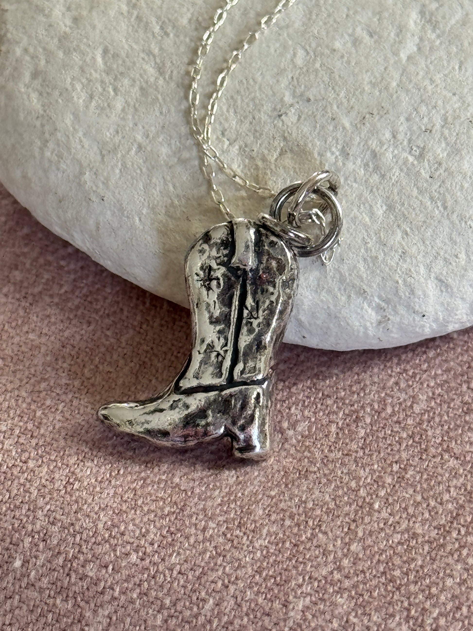 This beautiful cowgirl boot charm necklace was handmade using the lost wax method. Carved out of wax by myself and sent to the casted in Sterling Silver. This is for the souls who have that inner cowgirl in them and loves the moon.